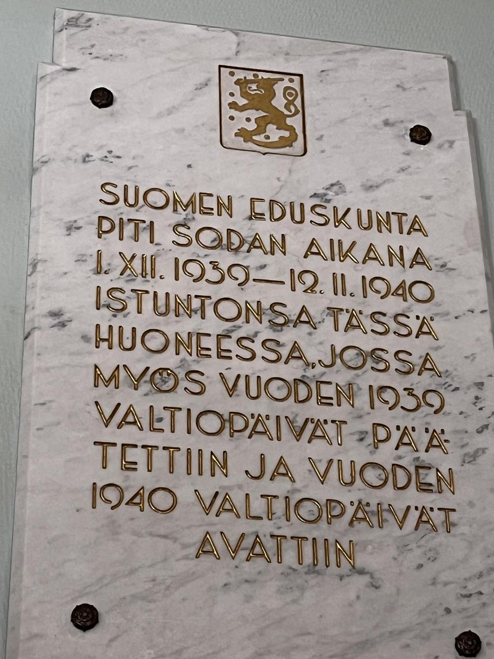 18.3.2024: Sokkotreffeillä vierailimme myös Eduskuntamuseossa. Oppaamme Maj-Lis Korhonen kertoi talon historiasta. 10 vkoa 34 istuntoa suojassa metsäisellä mäellä suojassa naapurin pommikoneilta, joita "vieraili" Kauhajoellakin 12 kertaa. Eivät löytäneet kohdettansa.