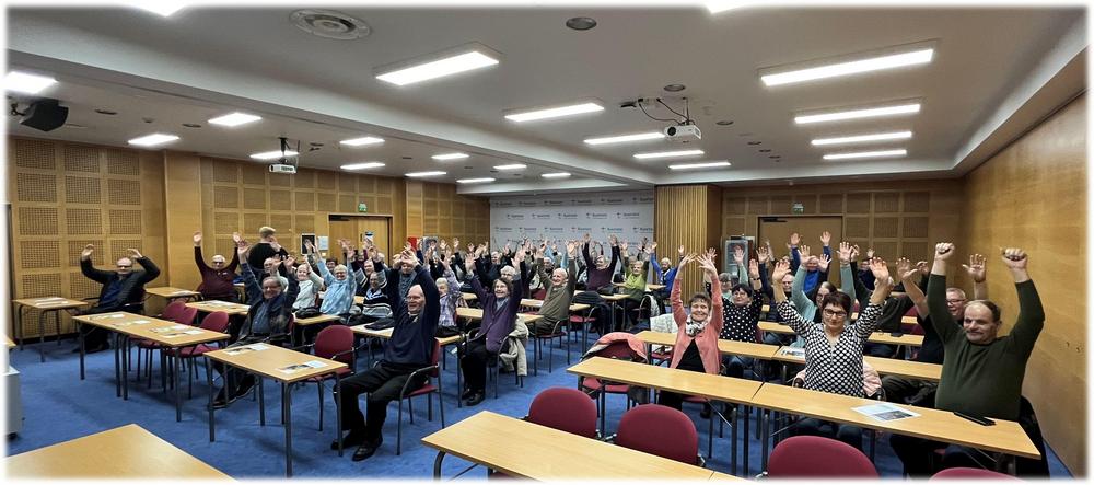 22.4.2024: "Kädet ylös !". Kuuliaisia senioreita, vaikka kyse olikin vain jumpasta. KIITOS Jouko onnistuneista sokkotreffeistä!