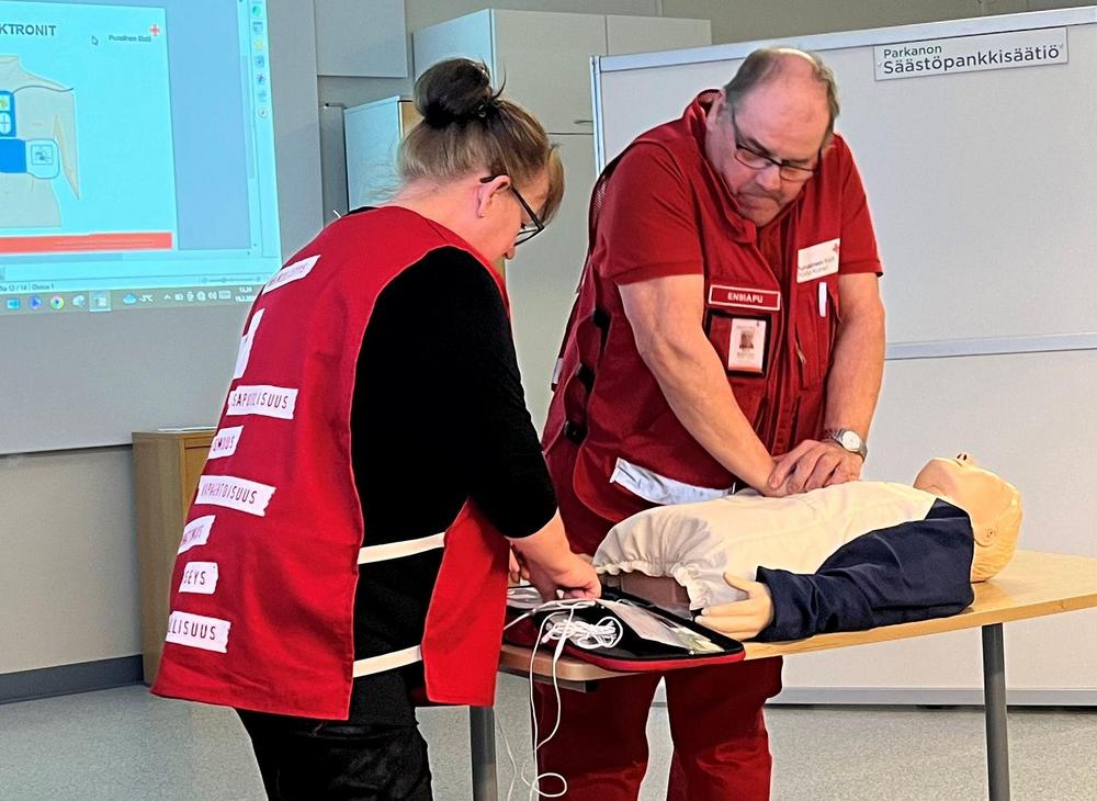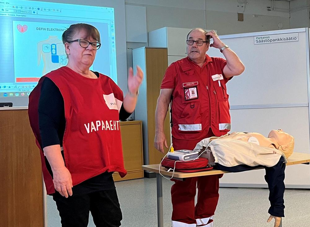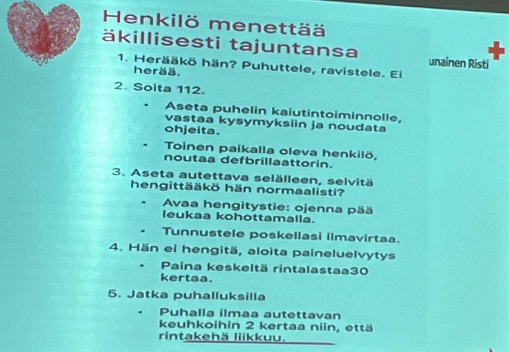 19.2.2024: Riitta Laihosalo ja Onni Hakamäki Kurikan SPR:stä olivat kertomassa ja NÄYTTÄMÄSSÄ miten oikea elvytys suoritetaan. Samalla opastettiin myös defin käyttöä. Suurkiitos! Hyvä kertaus, nyt osataan taas.