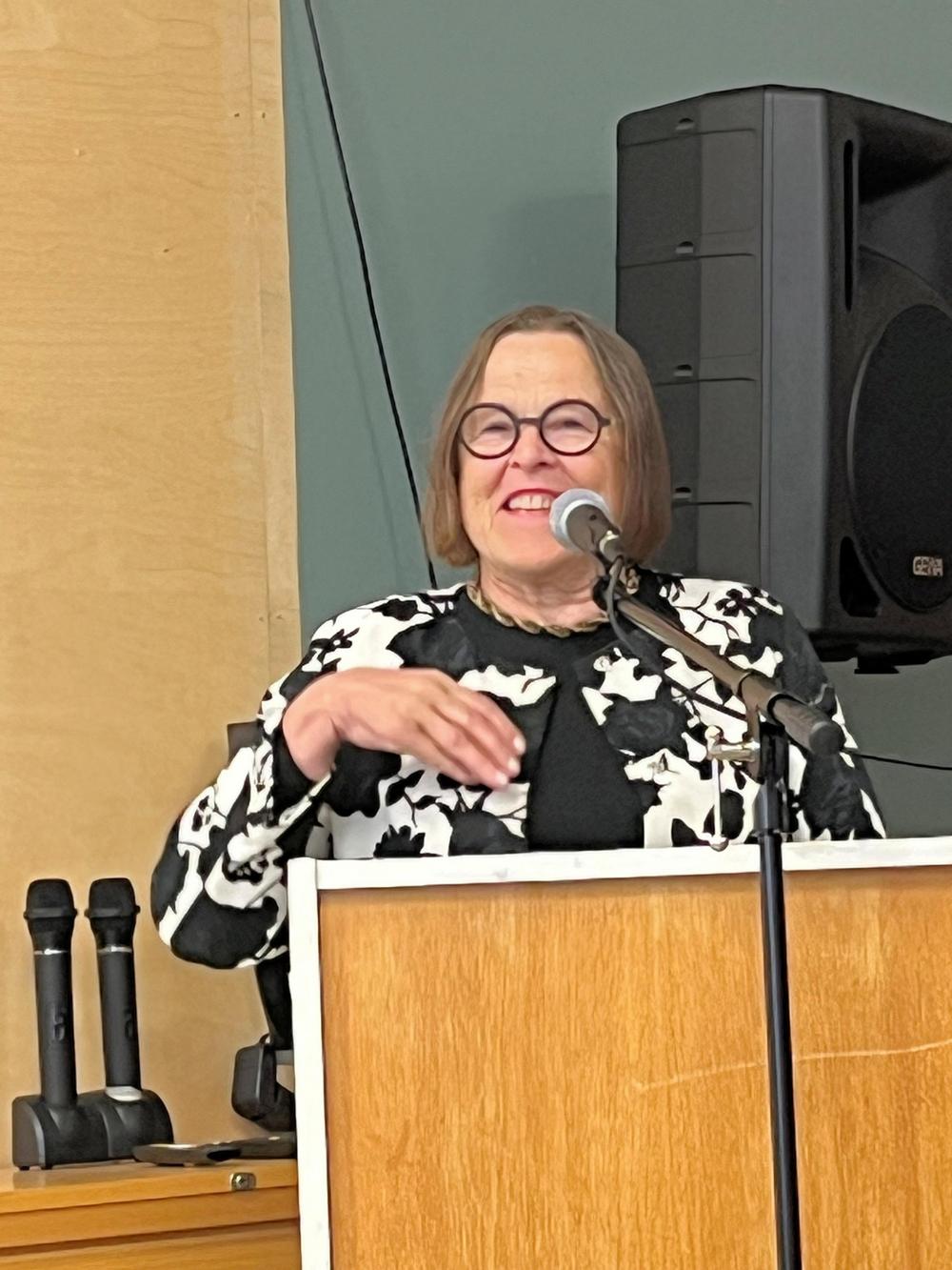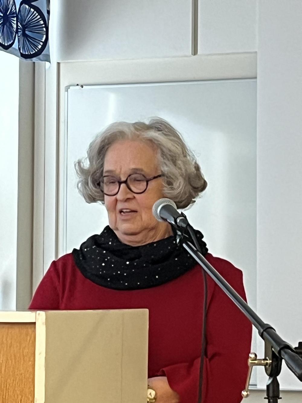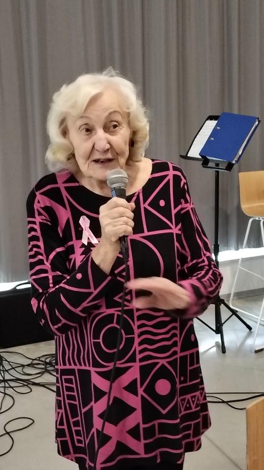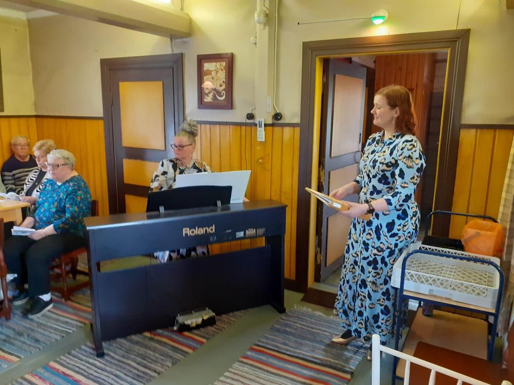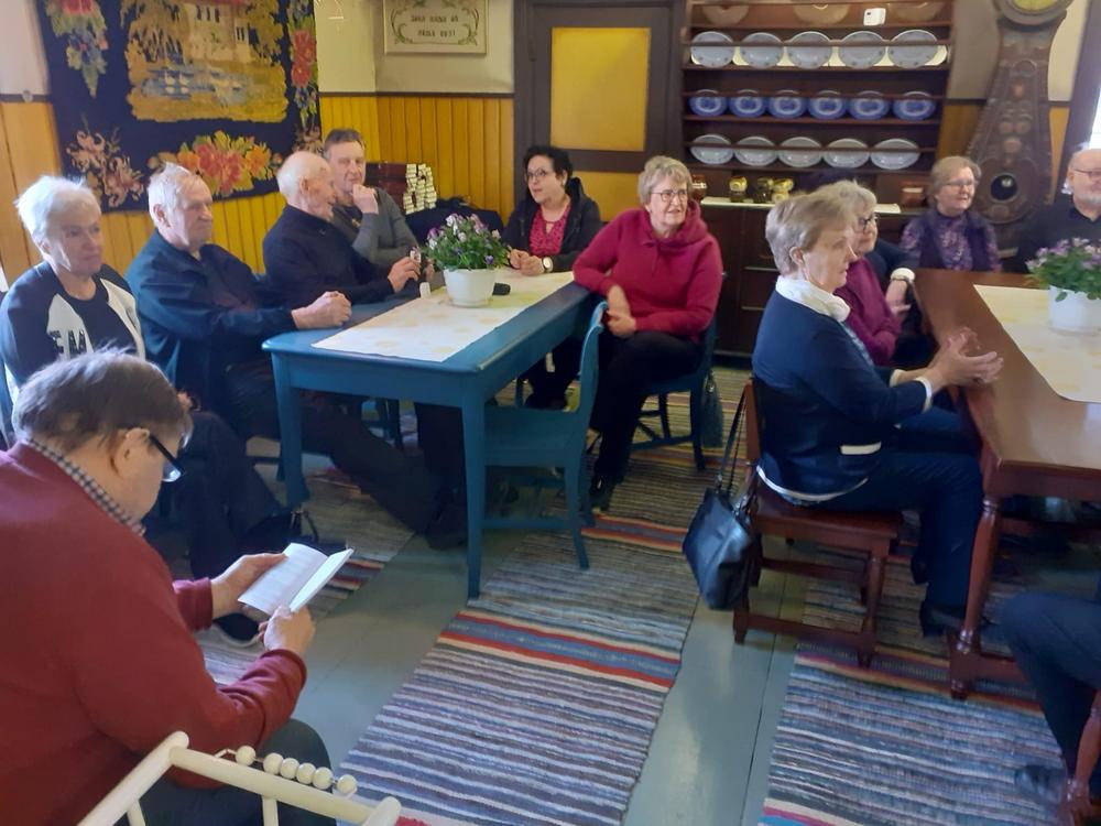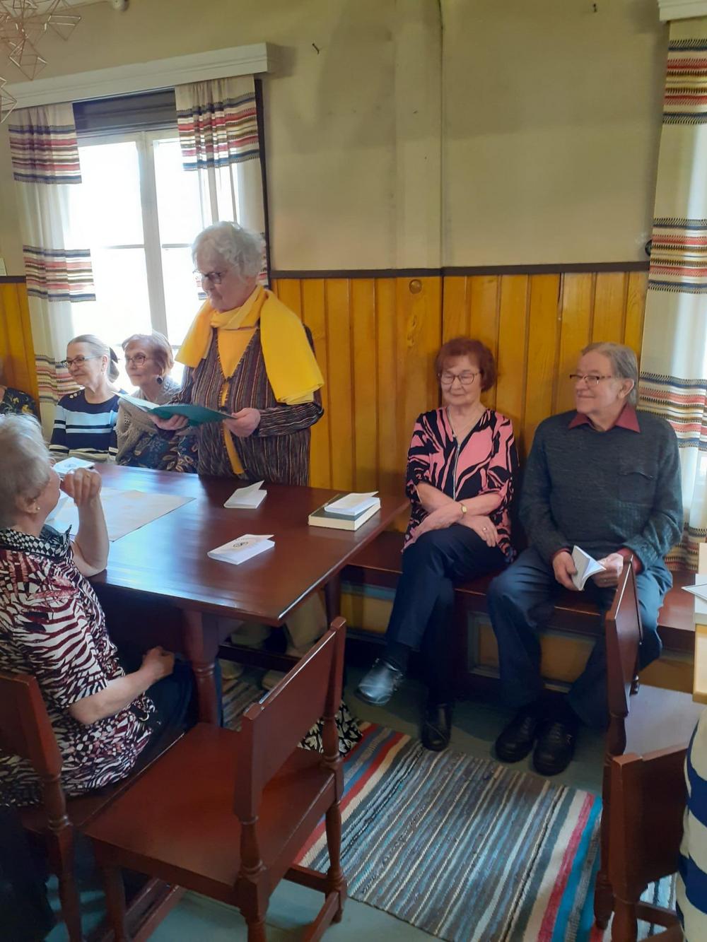 5.5.2025: "Kevät keikkuen tulevi" - teemalla Anna-Liisa Granqvist oli järjestänyt senioreille lohisopat ja esityksiä. Tässä kuvassa Kaija lukee.
