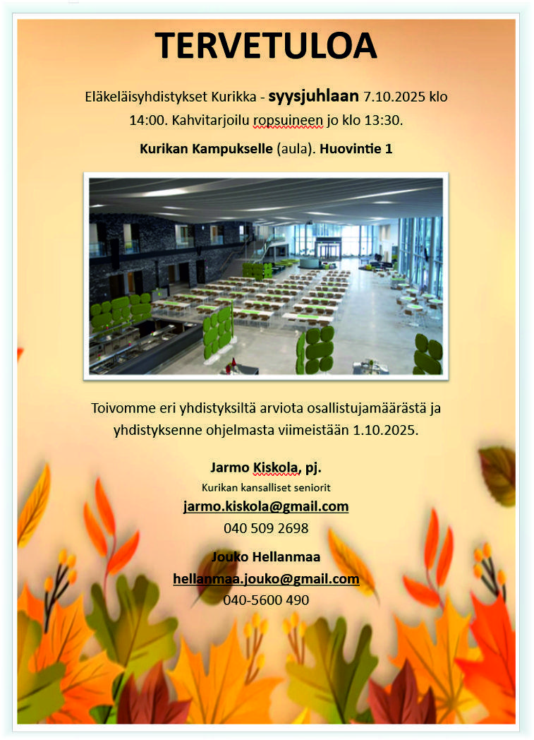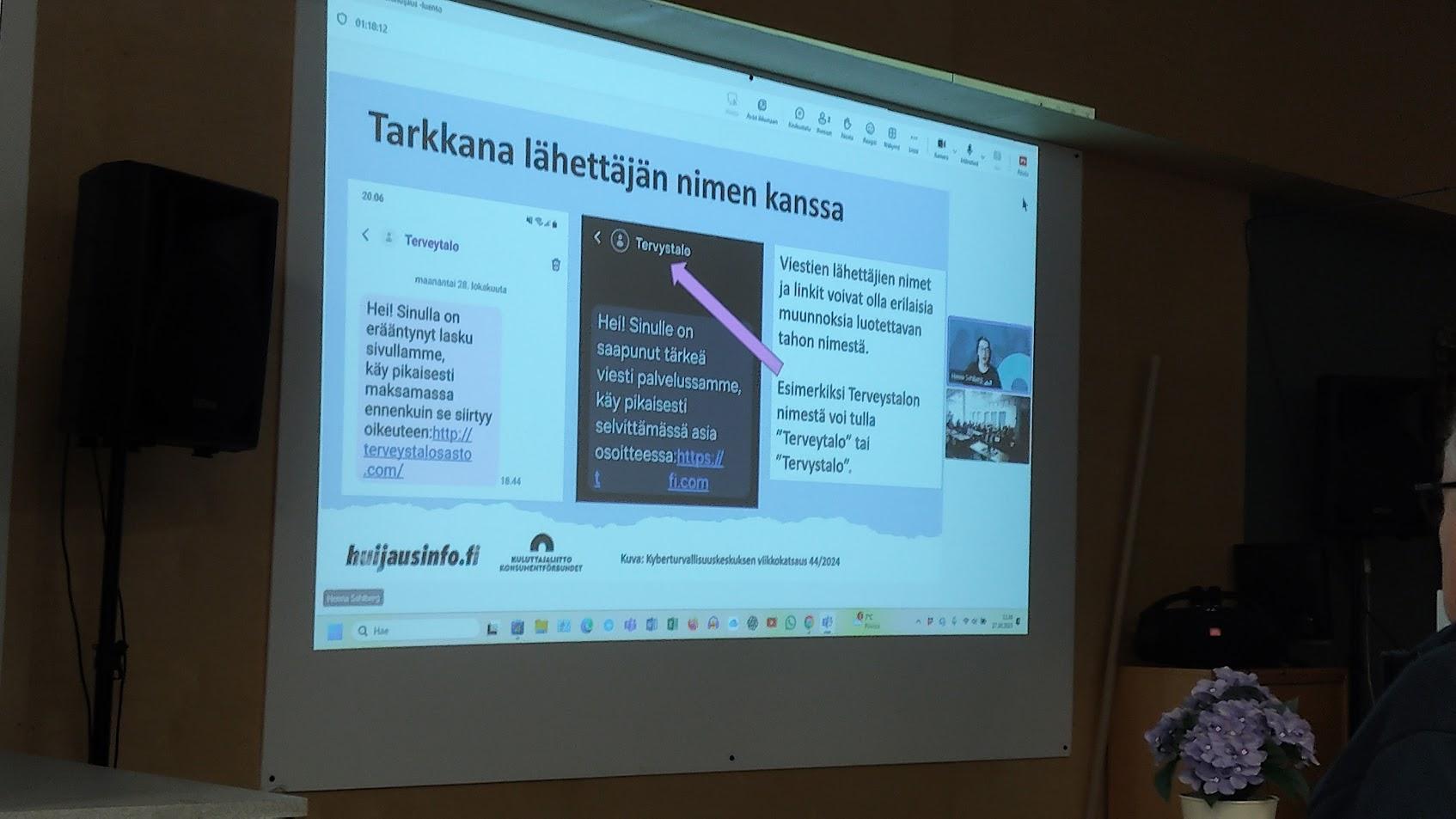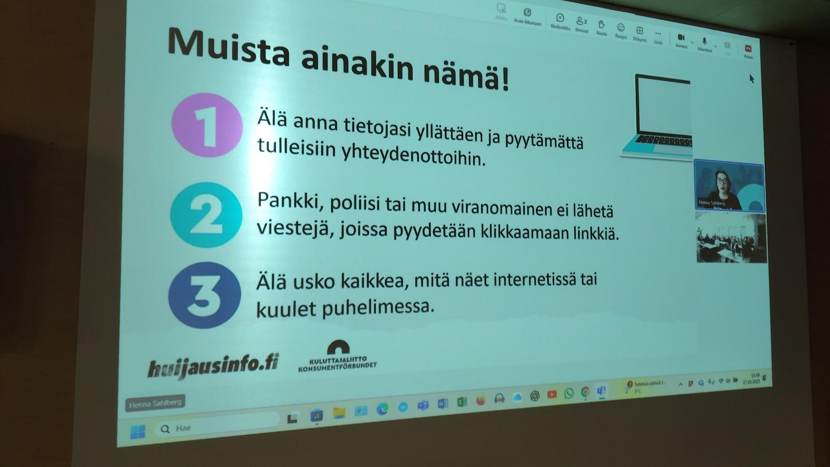 27.10.2025: Nettihuijaus Teamsin välityksellä. Luennoitsijana Henna Sahlberg Kuluttajaliitosta. Arto Mäkipelto hoiti tekniikan Kurikan päässä. Suurkiitokset Hannalle!