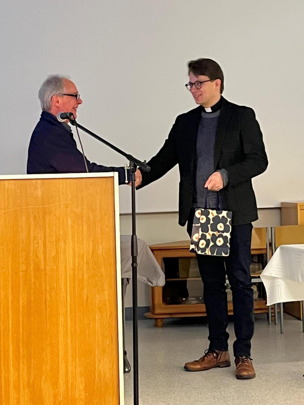 13.1.2025: Kirkkoherramme Jani Latva-Nikkola puhui kauniisti kasteesta, syliin ottamisesta ja kasteen merkityksestä elämäämme. Lapsena synnymme ja taivaan porteilla saamme jälleen lapsiksi tulla ja vaipua Jumalan syliin. Ajatus: "Sinä voi lähteä rauhassa. Kristuksen valo ei sammu elämän päättyessä."